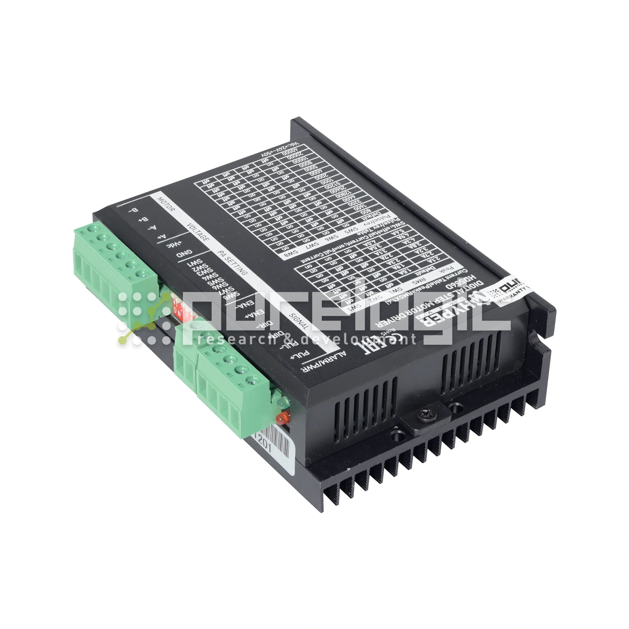 DSP драйвер шагового двигателя 50В/5.6А/200кГц. 16 режимов деления шага от 1:4 до 1:256. Оптоизолированные входы управления STEP, DIR, ENABLE. Автонастройка под ШД. Компенсация резонанса. Защита от КЗ обмоток ШД, от обратной ЭДС ШД, режим удержания ротора ШД.
