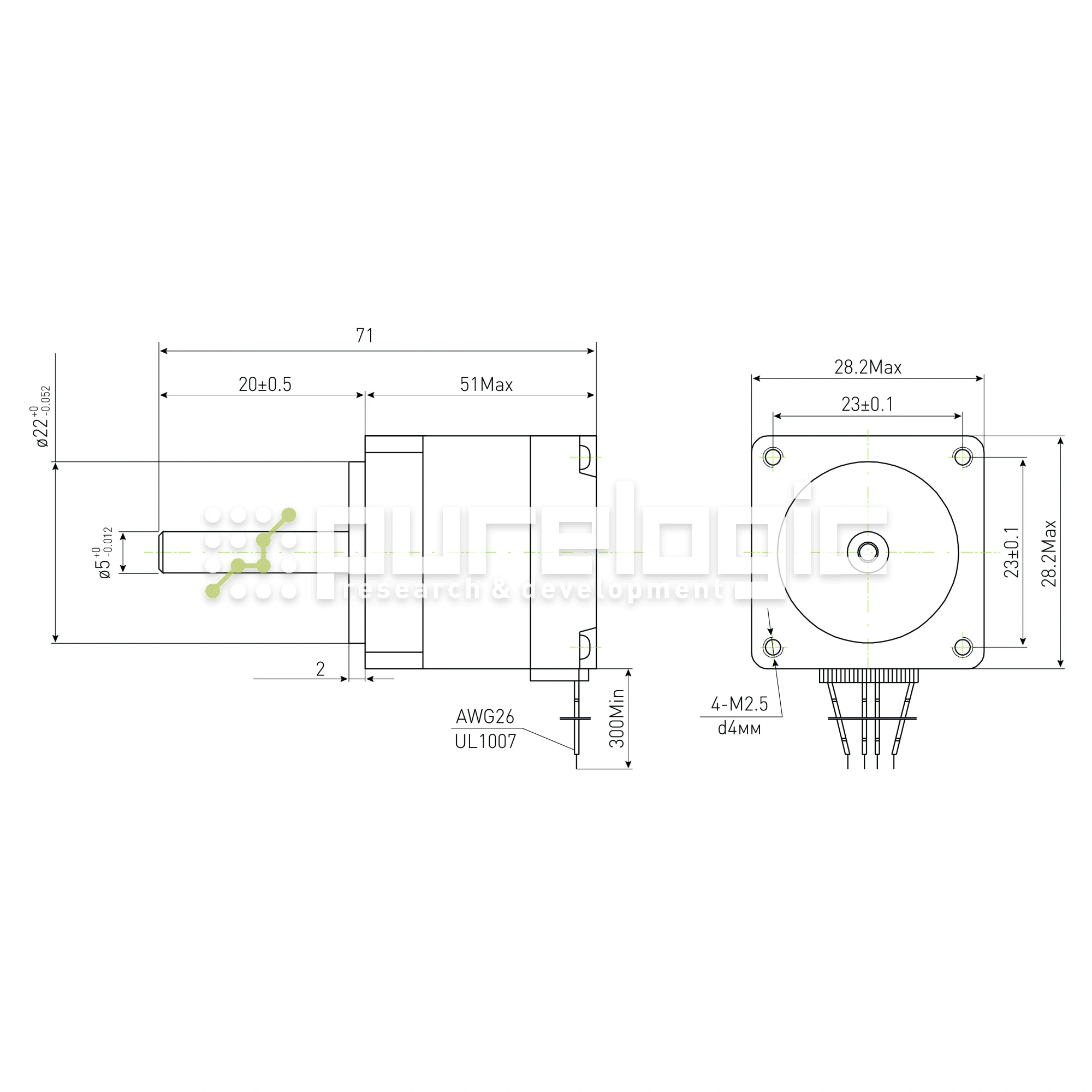 28x51мм, 2 фазы, 0.9 кг.см, вал 5мм, ток 1.0А, шаг 1.8°