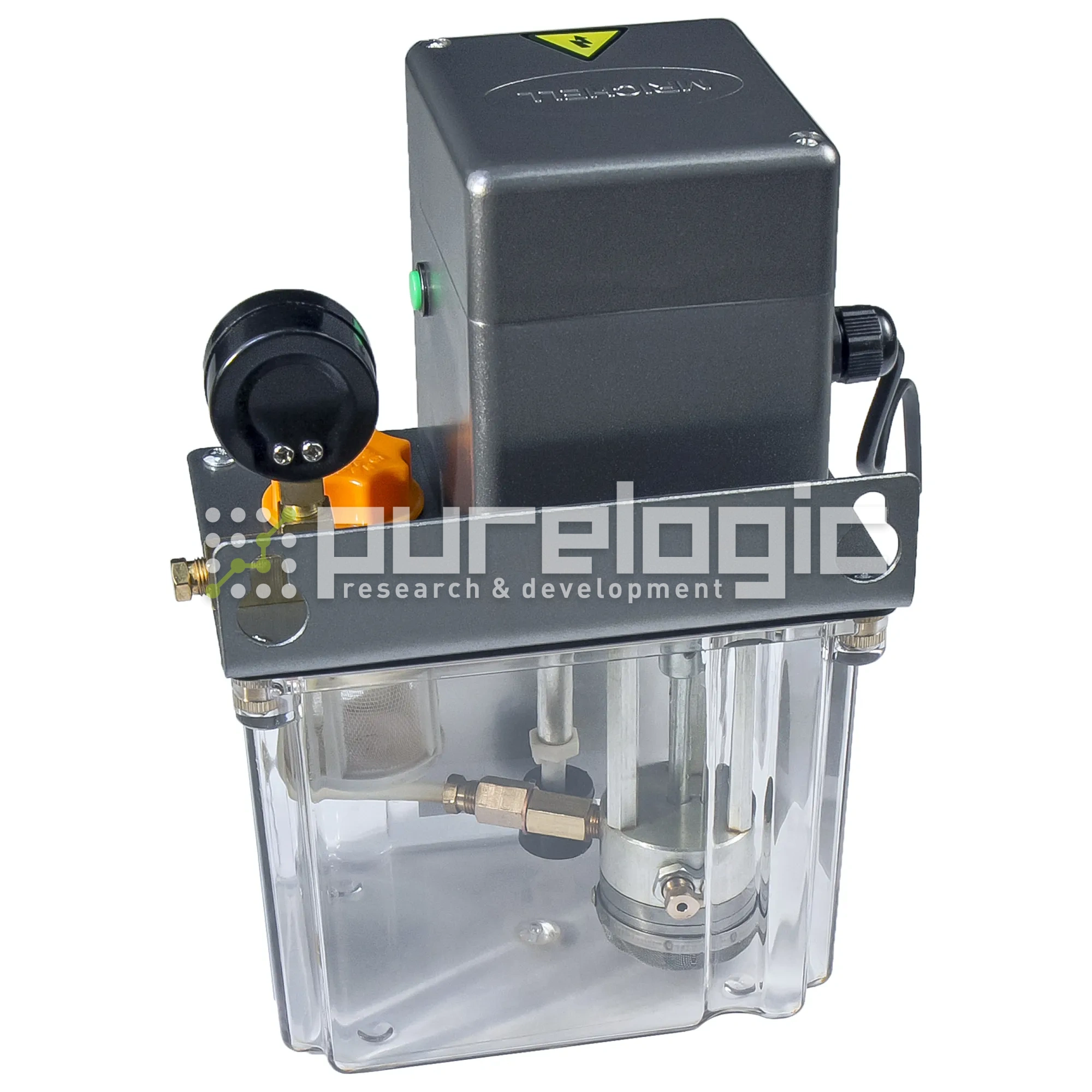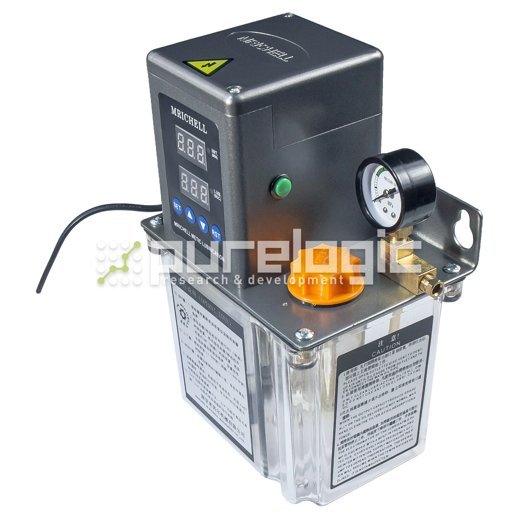 Автоматический насос для подачи смазки в гайки ШВП и каретки направляющих. Рекомендуется использовать масло вязкостью 30-46. ~220В, объем 1.5л, 0.13л/мин, пластик, штуцер 6мм.
