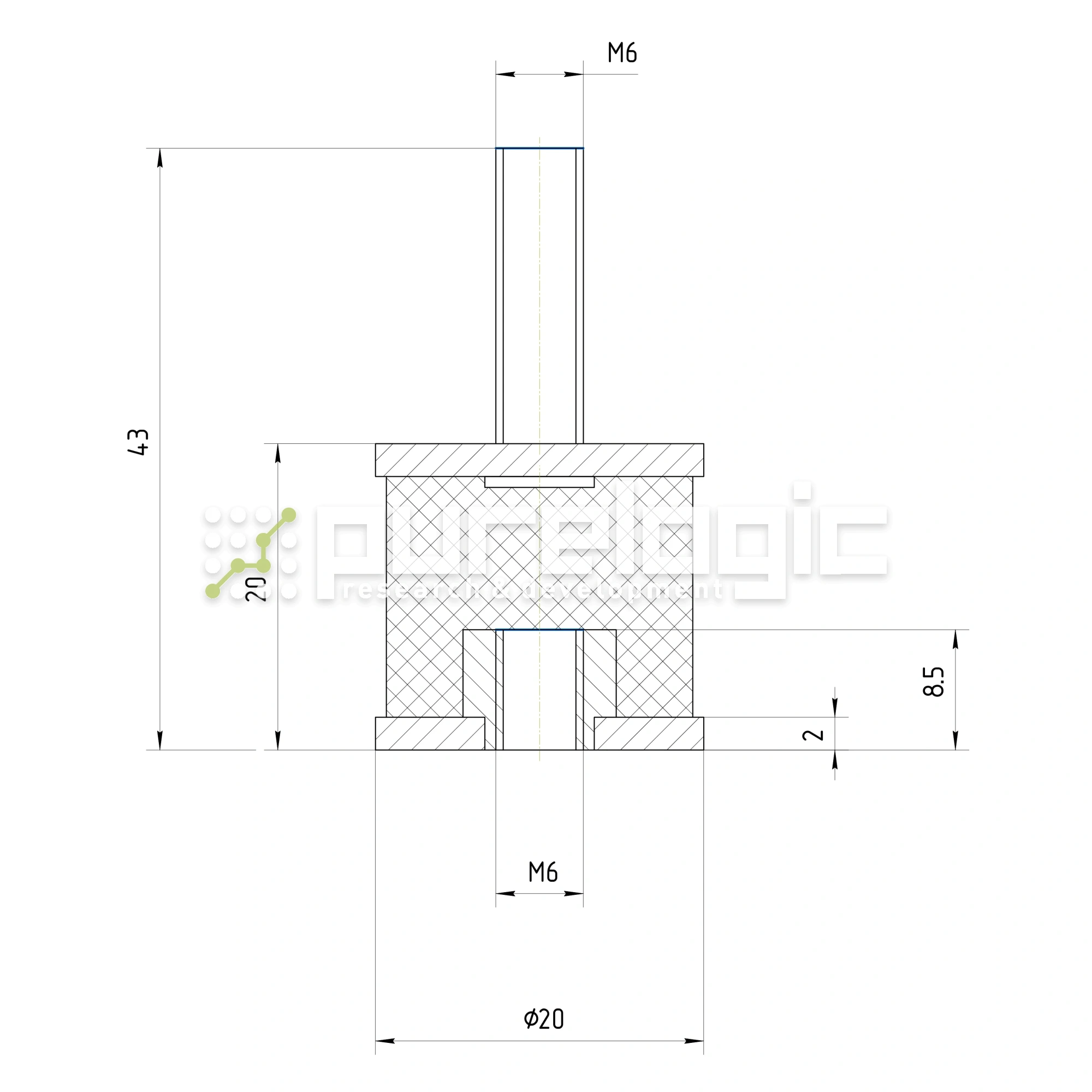 Виброопора диаметром 20мм и высотой 20мм. С резьбовым отверстием и шпилькой M6.